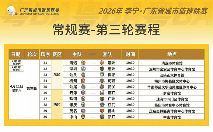 羊城晚报讯记者郝浩宇报说念:2026年广东省城市篮球联赛(粤BA)成例赛第三轮本周末战火重燃!本周六(11日)共有9场比赛,深圳VS惠州的比赛调遣至本周日(12日)进行。