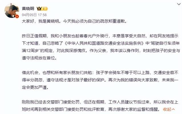 黄晓明很快删除了那条动态。第二天,也即是四月五日,他再次发文,承认我方的漂浮,并抒发了傀怍之情。他提到当作父亲,本应把孩子的安全和死守规则放在进军位置,还主动前去交警部门收受科罚。因为偶合假期,责任主谈主员提倡节后再完成具体阵势。他也借此领导其他家长,学会骑车并不等于不错纵容开拔,交通安全需要时期持重。