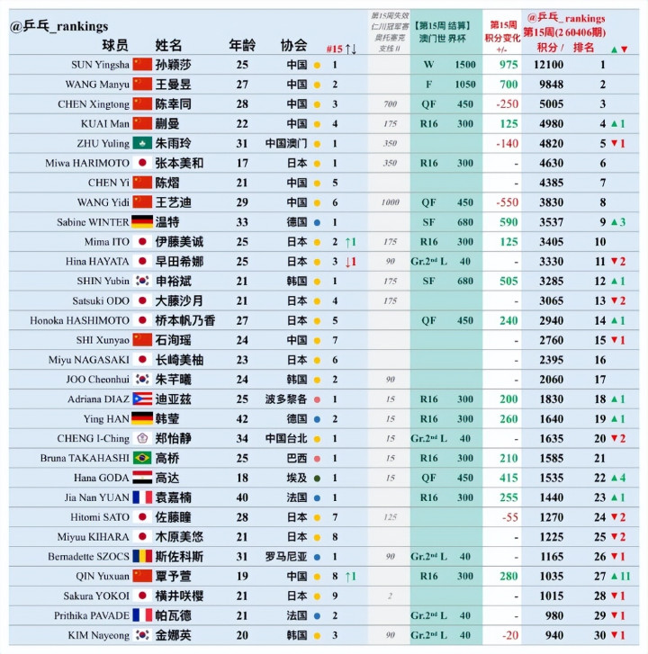 4月6日,天下乒联公布2026年第15周最新天下名次,本期名次新增刚收官的2026澳门天下杯赛事积分,计帐2025WTT仁川冠军赛积分,国乒王楚钦、孙颖莎取得天下杯男、女单打冠军入账1500个积分,仍然稳居男、女单打天下第一的位置,而向鹏因为仁川冠军赛积分失效名次骤降,小将温瑞博名次快速晋升已跃至国乒男队前三。