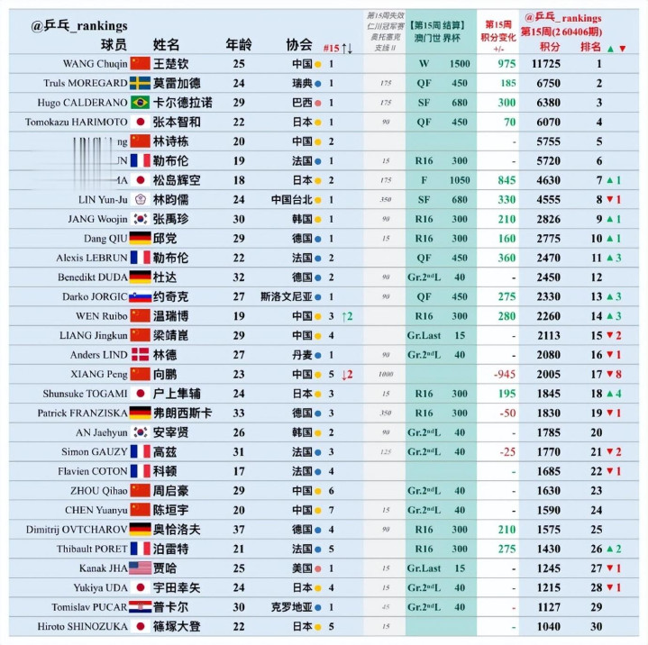王楚钦11725积分位列第一,林诗栋5755积分保抓不变名秩序五位,温瑞博凭借天下杯新进积分飞腾3个位次,以2260积分来到第14位,梁靖崑2113积分,下落2个位当今名秩序15位,向鹏下落8个位次,以2005积分名秩序17,周启豪、陈垣宇别离位列第23、24位。