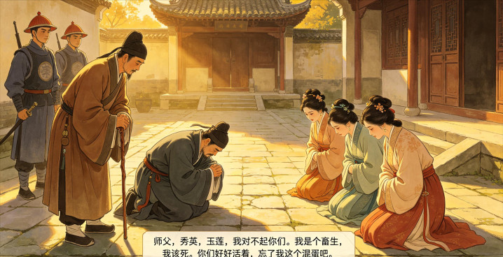王爷命东谈主将陈石生押解官府。临走前,陈石生跪在地上,给赵老倔磕了三个响头,又给赵秀英和钱玉莲各磕了三个头。他泪如雨下:“师父,秀英,玉莲,我抱歉你们。我是个家畜,我活该。你们好好辞世,忘了我这个混蛋吧。”