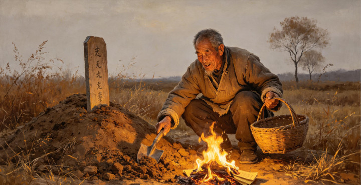 那座无名托钵人的坟,赵老倔每年王人去祭拜。他给坟添土、烧纸,对着坟头说:“伯仲,你的仇报了。你在何处安息吧。下辈子投个好胎,别再当托钵人了。”