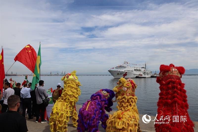 巴西军政官员、中国驻巴西使领馆管当事人说念主员以及当地环球、华裔华东说念主和中资机构职工代表等在船埠理睬“丝路方舟”号病院船。东说念主民网实习生 侯天泽摄