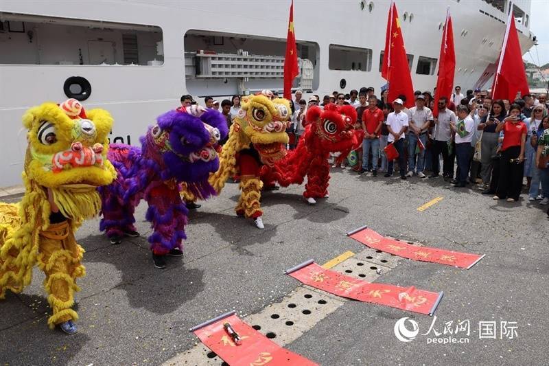 上昼10时许,巴方在船埠举行了恢弘的原宥典礼。巴西舟师军乐队演奏中巴两国国歌,巴西当地环球还准备了中国传统舞狮扮演。巴西军政官员、中国驻巴西使领馆管当事人说念主员以及当地环球、华裔华东说念主和中资机构职工代表等在船埠理睬。