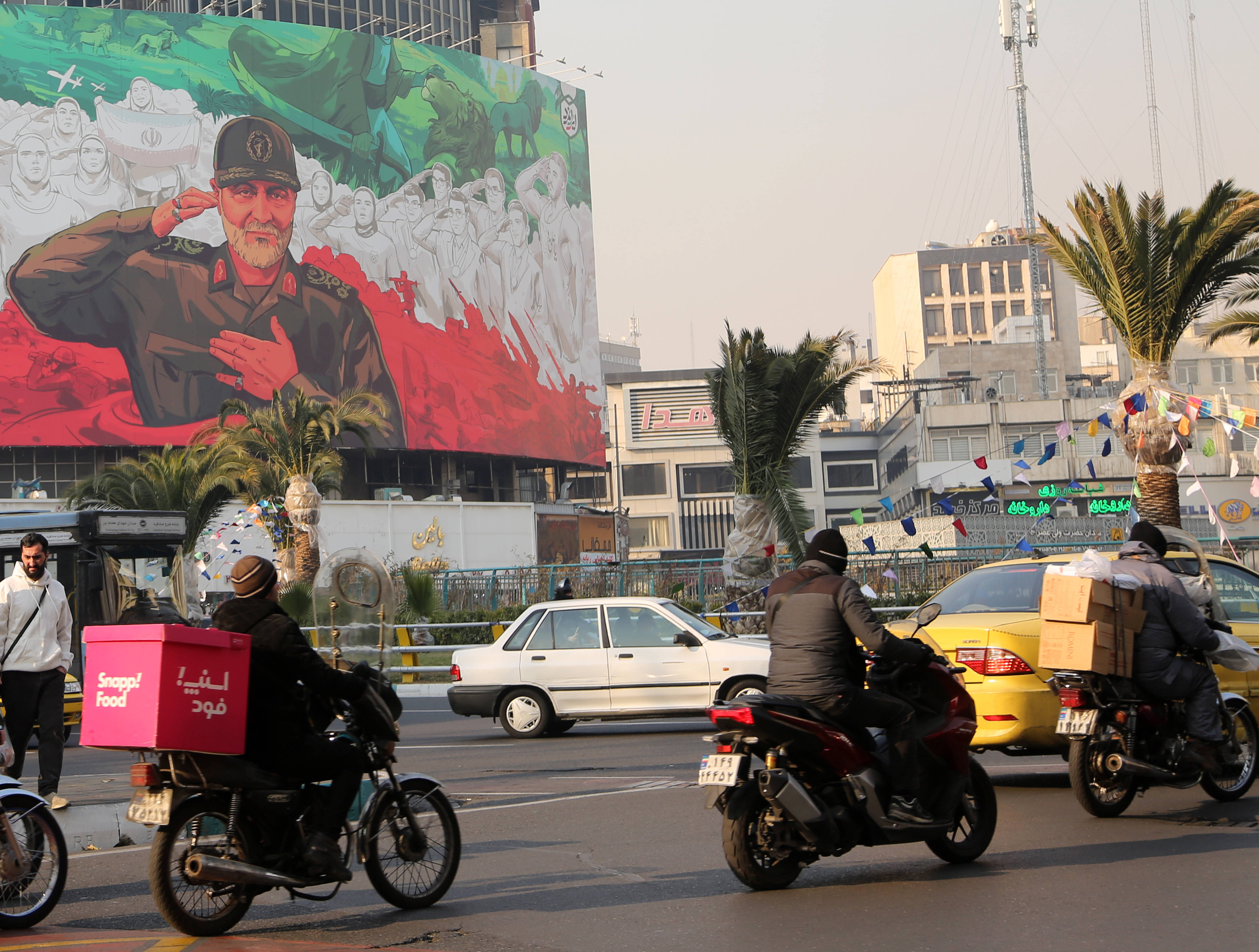 2026年1月6日,在伊朗皆门德黑兰街头,车辆过程一幅绘有伊遇袭身一火的高等将领卡西姆·苏莱曼尼形象的宣传海报。新华社发近日,伊朗因物价高潮和货币贬值爆发请愿行径,多地发生骚乱,变成东谈主员伤一火。特朗普在多个局势称好意思国“正密切关爱”伊朗局势,胁迫或对伊朗进行“严厉打击”。