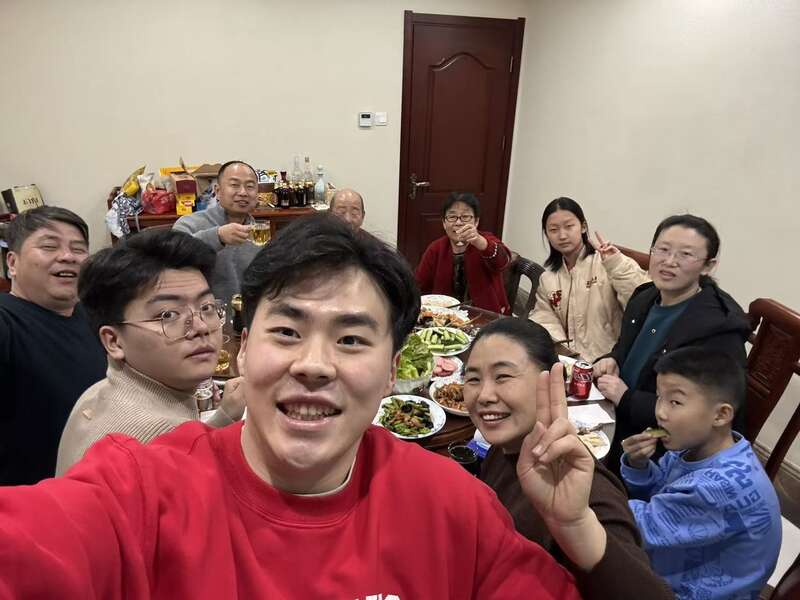 除夕夜,刘育宇与家东谈主分享团圆饭。受访者供图